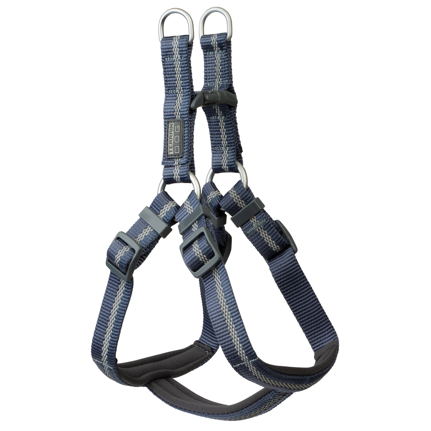 - Two anodized aluminum dees provide a reliable leash attachment point at the top of the harness
